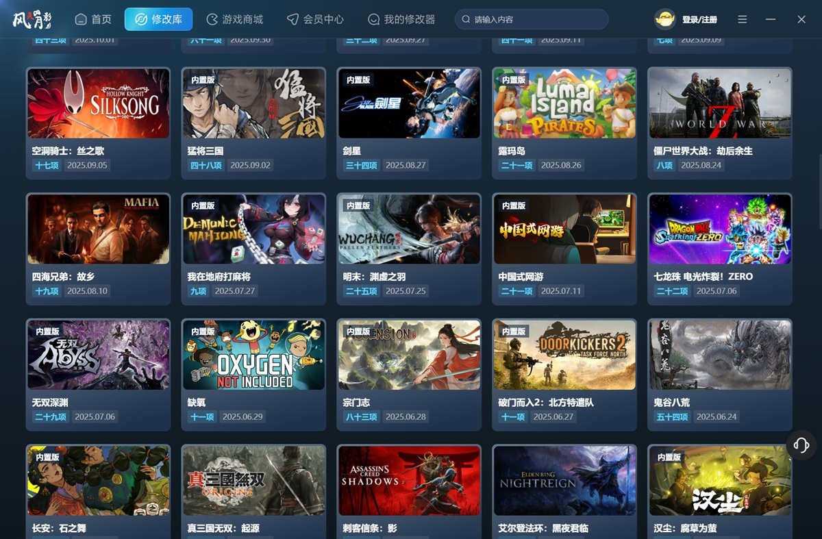 风灵月影修改器是一款单机游戏修改器的整合工具,使用本软件,你能够在线下载海量的单机游戏修改器软件,风灵月影制作的修改器囊括了目前世界最热门的游戏,无论你玩的是什么游戏都能在这里找到实用方便的修改器。