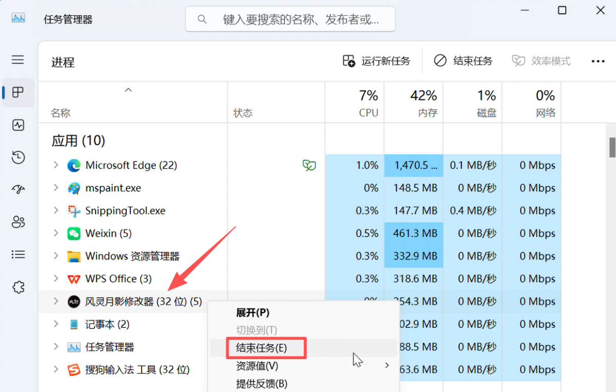 2、然后找到风灵月影修改器,右击“结束任务”。