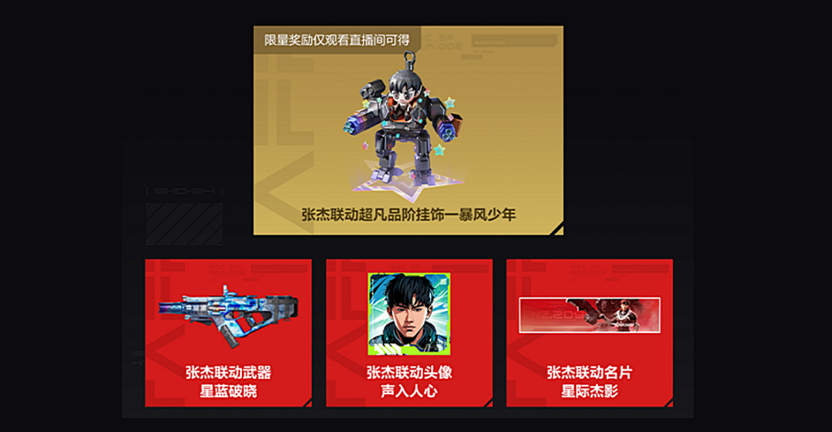 ●活动奖励:张杰联动超凡品阶挂饰-暴风少年、张杰联动武器-星蓝破晓、张杰联动头像-声入人心、张杰联动名片-星际杰影