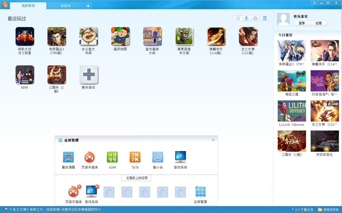 快玩游戏盒是一款游戏下载客户端。独特的P4P+云技术,游戏一点就用,无需安装,内置90000多款游戏,快玩游戏用户选择好自己喜欢的游戏后,通常只需求加载几秒到十几分钟即可开始游戏,彻底颠覆了普通客户端游戏“下载、解压、安装、启动”的模式,实现了所有游戏“即点即玩”效果,绿色快捷,自动更新,大大降低了玩家对大型客户端游戏下载和使用的门槛。