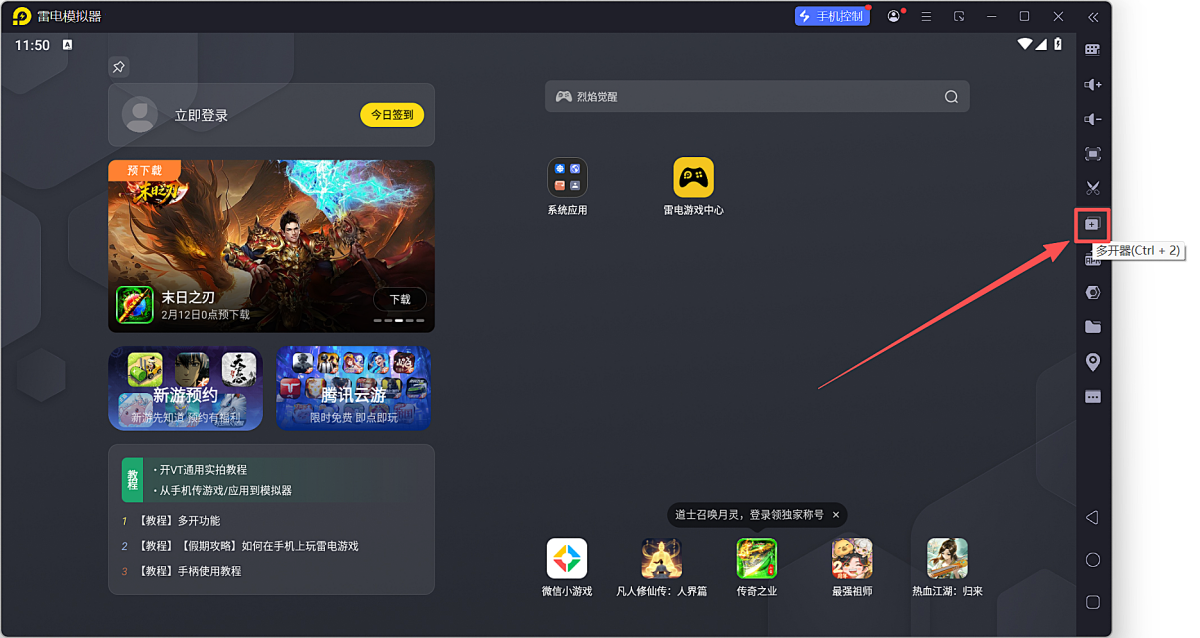 3、在打开雷电模拟器后,点击侧边工具栏上的“多开”按钮即可启动多开器。