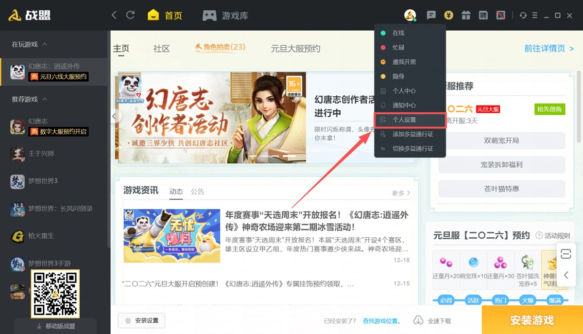 步骤1、打开战盟客户端,点击顶部头像,选择【个人设置】