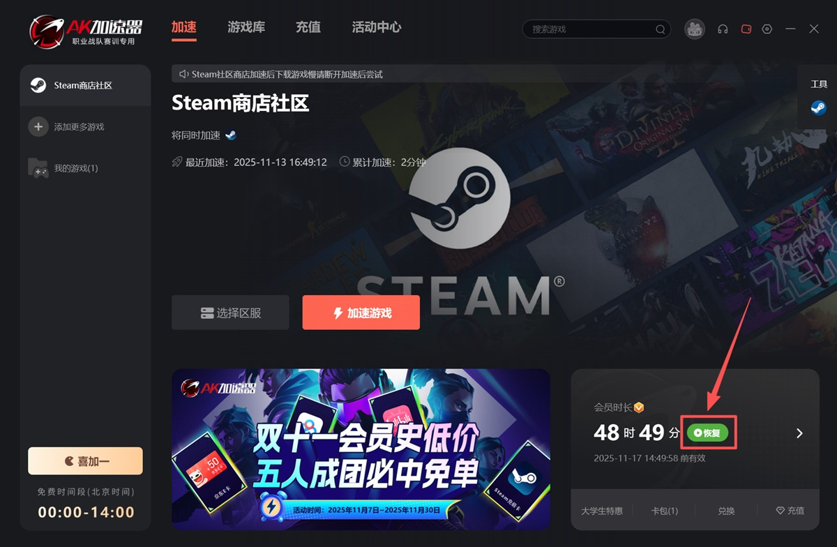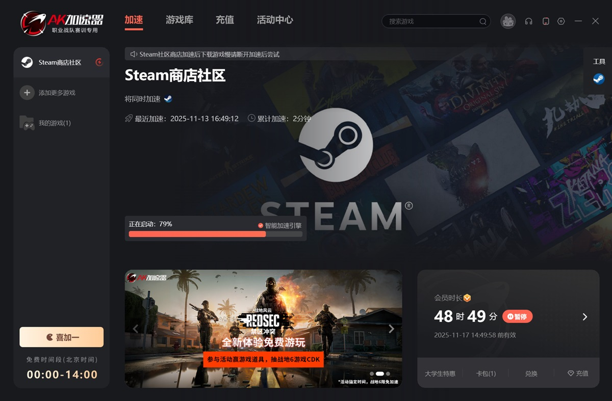 每天0:00-14:00固定时段免费,为游戏玩家提供流畅、稳定的加速服务。