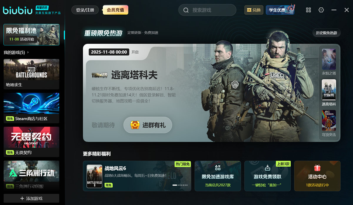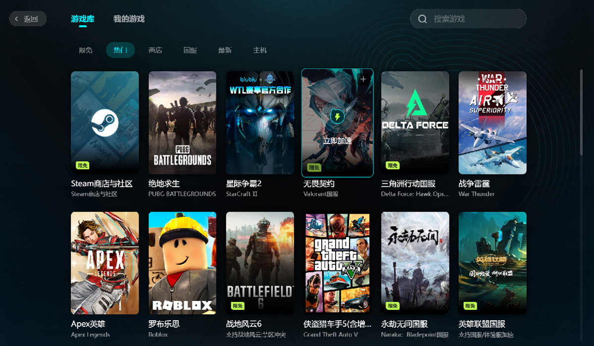 2、专业级游戏加速:支持国内外海量热门游戏,PUBG(绝地求生)、Apex、CS2、英雄联盟、魔兽怀旧服、最终决战、博得之门3、使命召唤系列、艾尔登法环、永劫无间、彩虹6号、战地系列、暗黑破坏神等一键加速,痛快畅玩!