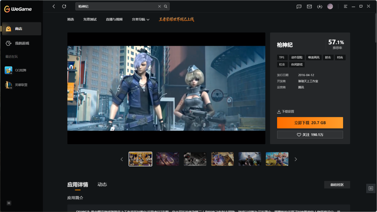 《枪神纪》是由腾讯游戏琳琅天上工作室历时数年采用虚幻3引擎,自主研发的首款第三人称时尚动作射击网游。游戏以创新为开发理念,颠覆性的采用了时尚酷帅的人物风格设定,并首次在射击网游中推出了职业系统,游戏中共有九大各具特色的职业供玩家选择,同时游戏还采用真人动作捕捉技术,在射击网游中颠覆性的加入了动作元素,让玩家不再是只能在平面上呆板的一对一点射,更可体会到飞檐走壁的自由操作感和近身格斗的爽快感。