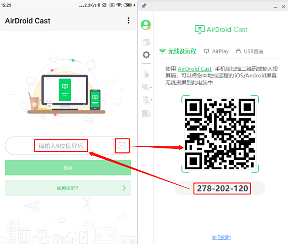 步骤2、需要将电脑上的投屏码输入到您的 Android 设备,连接两台设备并启动投屏请求。也可以扫描二维码以建立设备之间的连接。