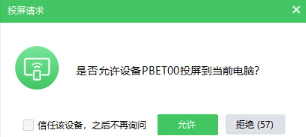 步骤3、在手机上发起投屏后,电脑上就会出现一个投屏请求窗口“是否允许设备 xxx 投屏到当前电脑?” 。请单击允许接受请求。出现提示时,如果您不希望每次都出现请求,请选中“信任该设备,之后不再询问”