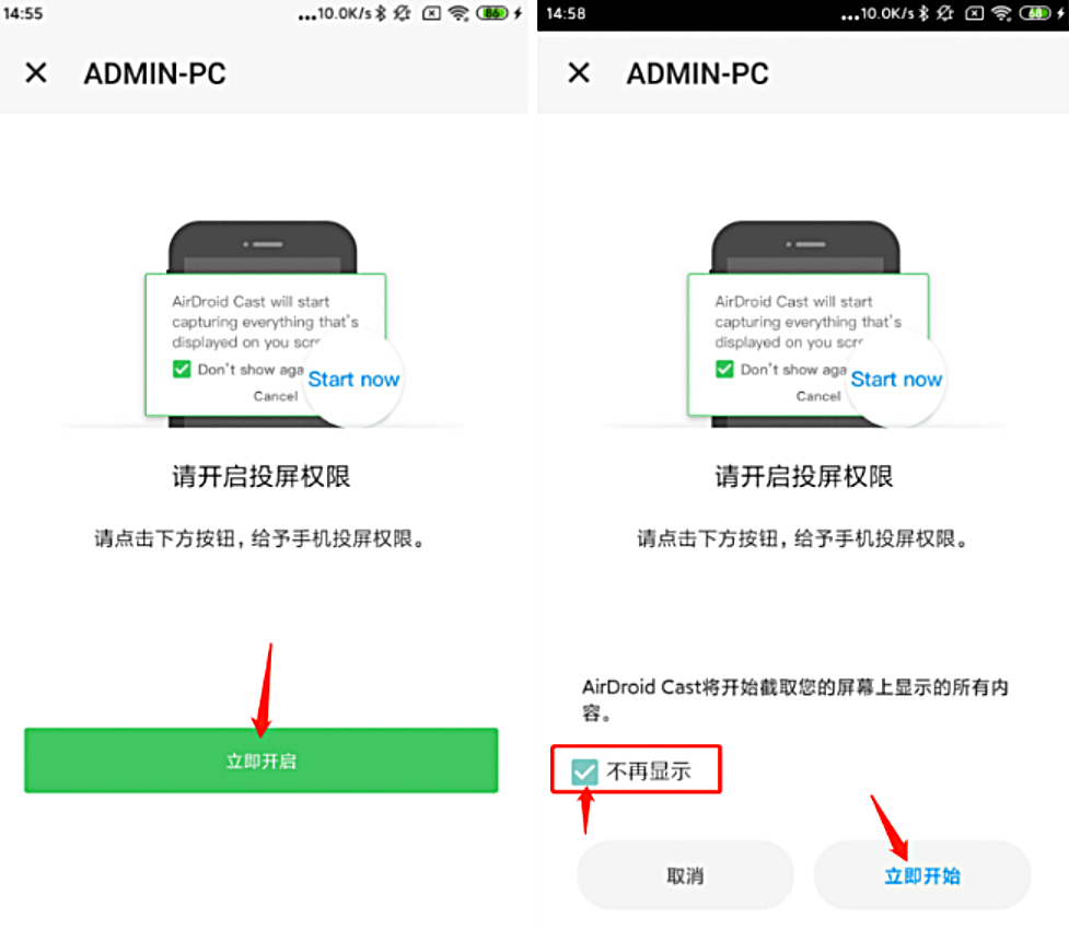 步骤4、接受电脑的投屏请求后,Android 设备上会弹出投屏权限页面和窗口“AirDroid Cast将开始截取您的屏幕上显示的所有内容”。请点击“立即开始”并根据提示进行授权。