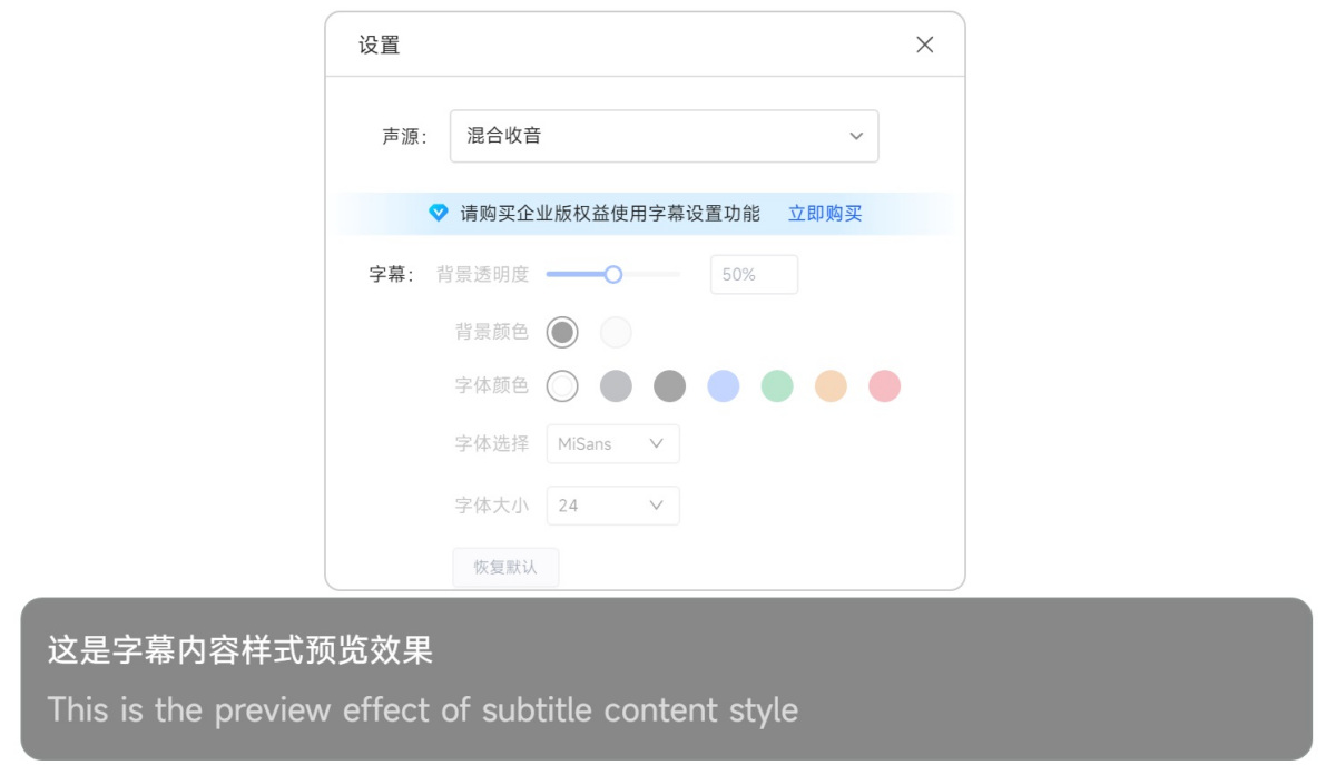 可以在客户端软件中通过应用工具栏中的“字幕设置”模块,可根据会议场景和需求,对字幕内容中转写和翻译内容的字体、大小进行设置;同时,字幕模式下,也可以对字幕中显示内容的行数进行设置;也可进行投屏端logo的自行上传。
