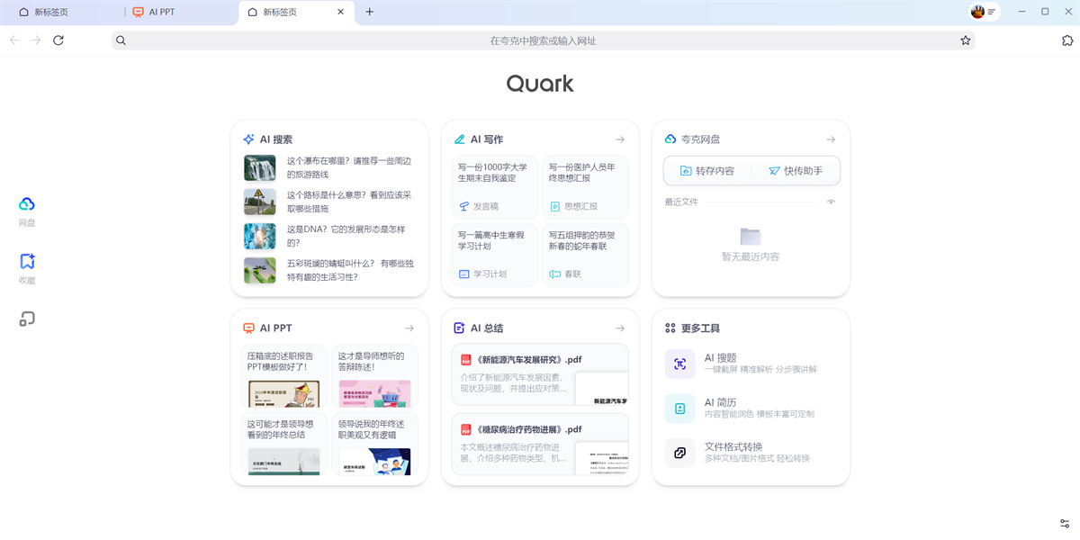 AI解析文档/网盘内容,智能总结、翻译、生成脑图,对话式快速获取信息;输入主题一键生成PPT;PDF、Office和图片文件格式任意互转。