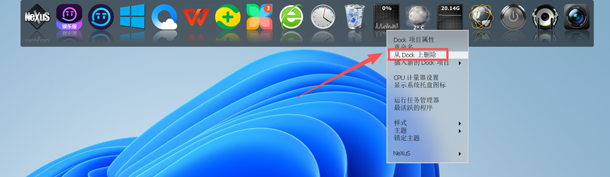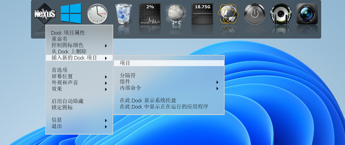 步骤1、下载并打开Winstep Nexus客户端,将鼠标放在停靠栏,右键选择【插入新的Dock项目】-【项目】