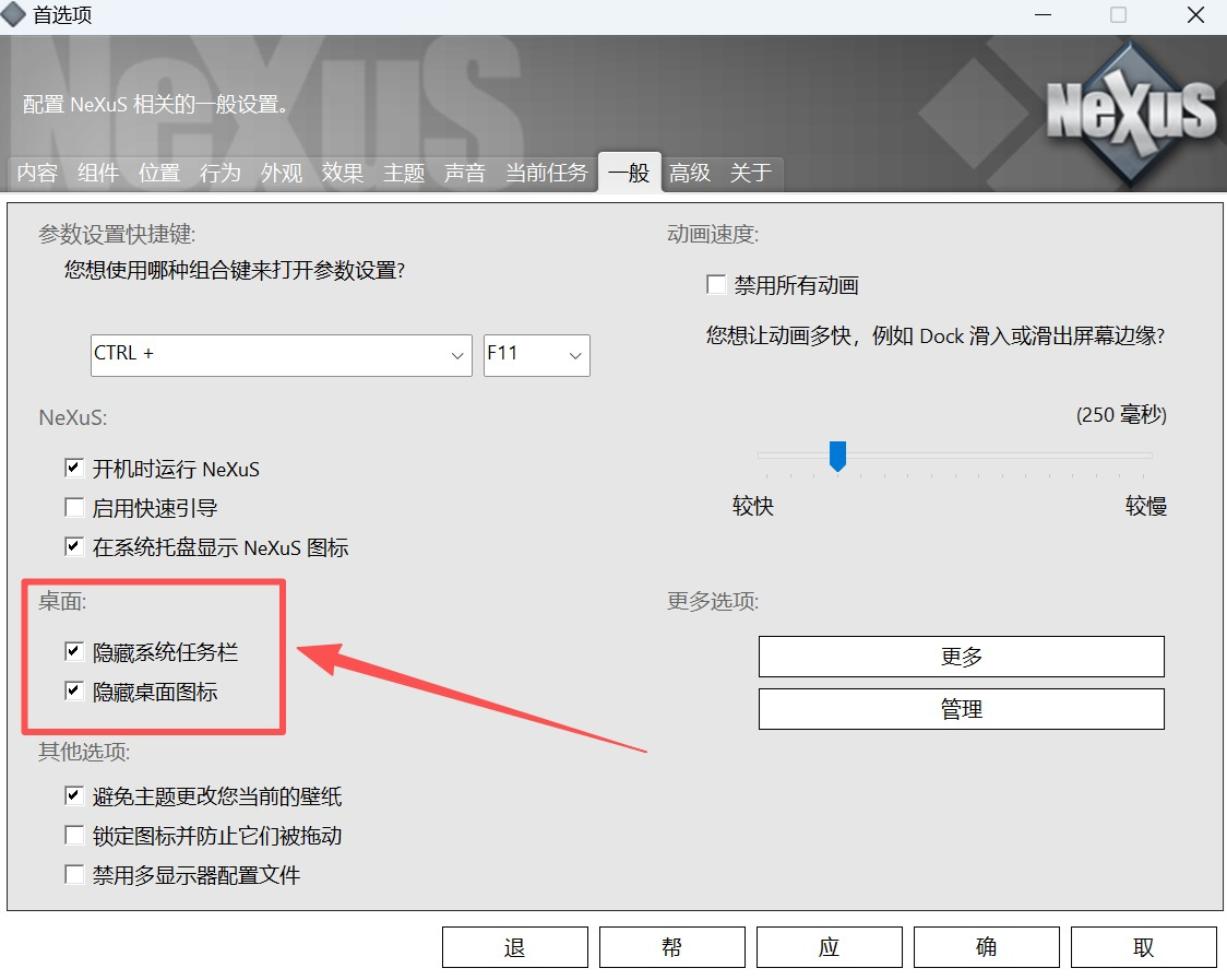 步骤8、选择【一般】,勾选【隐藏系统任务栏】【隐藏桌面图标】