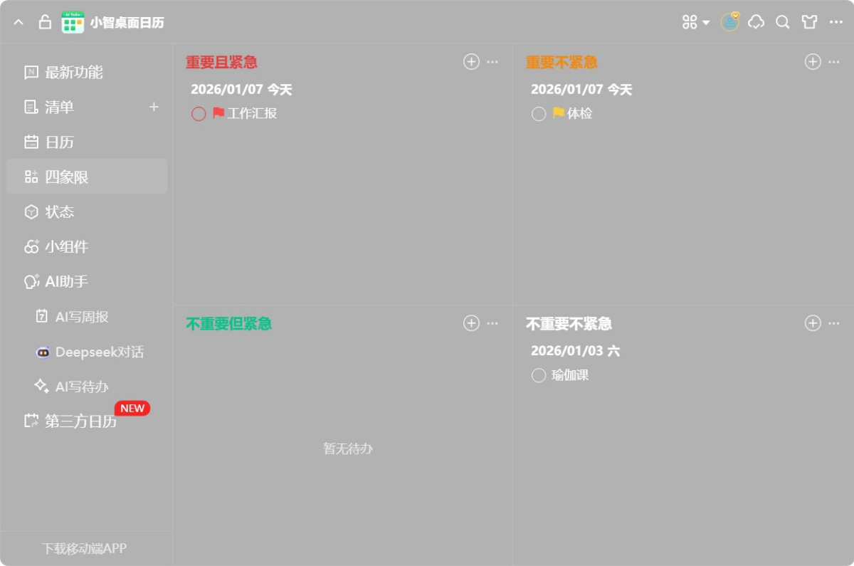 小智桌面日历(原小智ToDo),致力于给用户提供记录待办,管理日程等所需功能和内容服务,还可以多终端数据同步,以及未来拓展的番茄钟、小习惯打卡等,让用户可以更高效管理自己的时间任务,快乐生活,畅快工作。