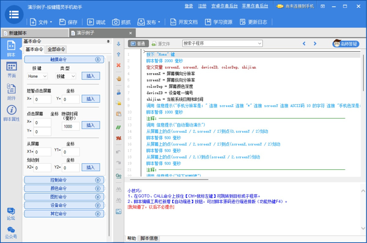 按键精灵手机助手是配合按键精灵手机版进行使用的pc端软件。用户可以通过该软件高效快速的不受设备限制的编辑和使用脚本,软件界面简洁清爽,操作简单便捷,是一款非常好用的软件。使用按键精灵手机助手,你可以在电脑上模拟手指在屏幕上的动作,是手机应用开发工作者的工作助手,帮助用户解放你的双手。