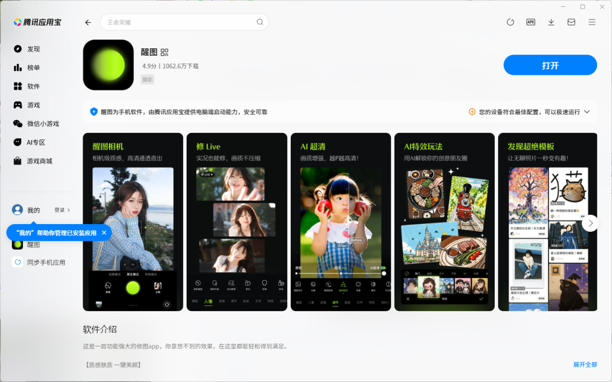 在小杜下载站下载最新安装包,按提示先安装应用宝电脑版(已安装会直接调用打开,未安装应用宝时,手机APP无法独立在电脑上运行),然后在应用宝里安装醒图,安装好后,直接打开登录就能玩了。