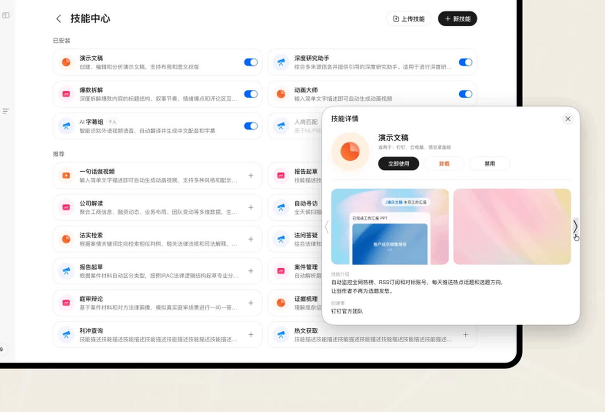 技能中心提供丰富的预置技能,涵盖文档处理、数据分析、演示文稿等场景。你还可以上传自己的技能,让悟空成为你的专属定制助手。