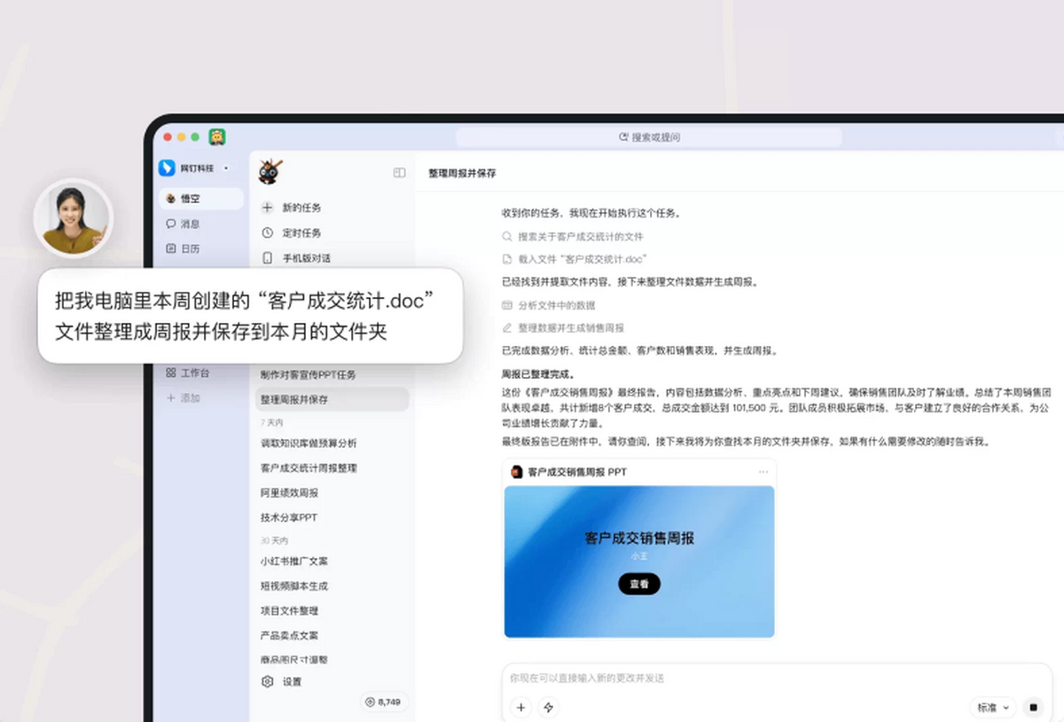 传统 AI 助手只能回答问题、生成文本。悟空更进一步—它能直接操作你的电脑完成任务。不是告诉你怎么做,而是直接帮你做。