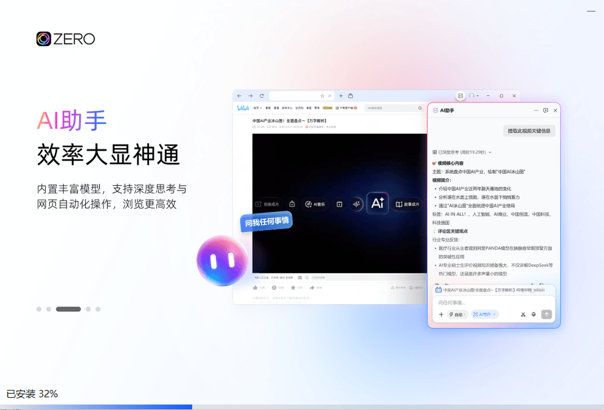 ZERO浏览器是一款极简、轻量化、无广告、更智能的的新一代PC端AI智能浏览器,内置AI搜索、AI 助手、AI 办公、AI换肤等高效便捷工具。