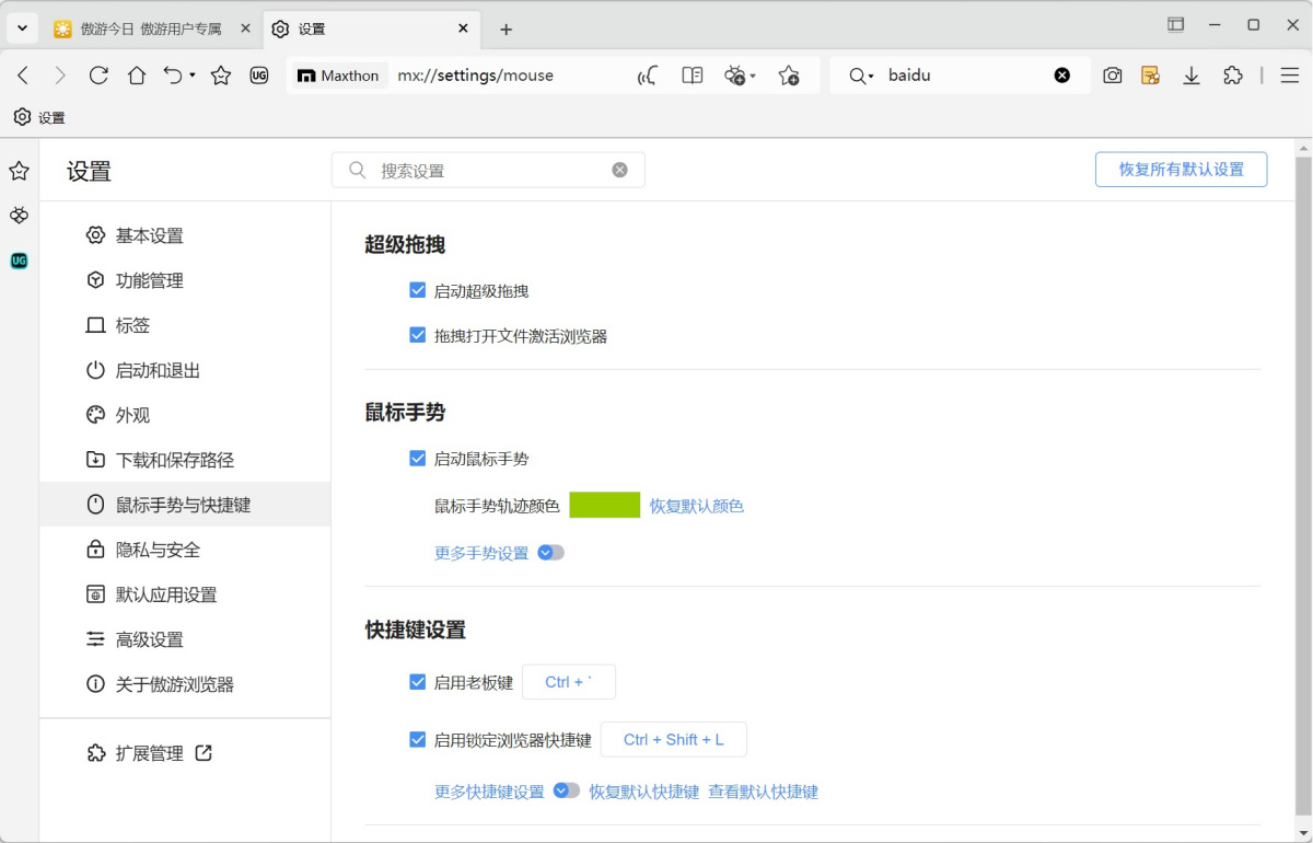 1、鼠标手势:鼠标手势通过简单的动作提供直观的导航控制,让在Maxthon中的浏览更加快捷。