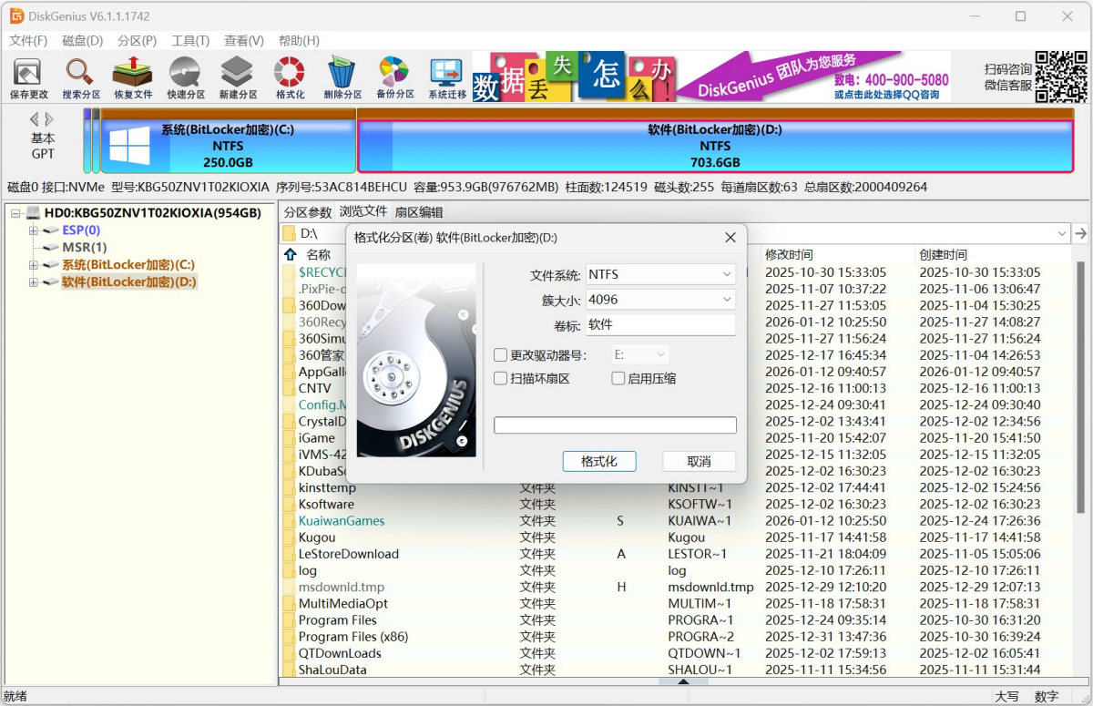 2、格式化分区、克隆分区、克隆磁盘等功能,为保证操作顺利完成,如果目标分区为BitLocker加密分区,则取消其BitLocker加密状态。