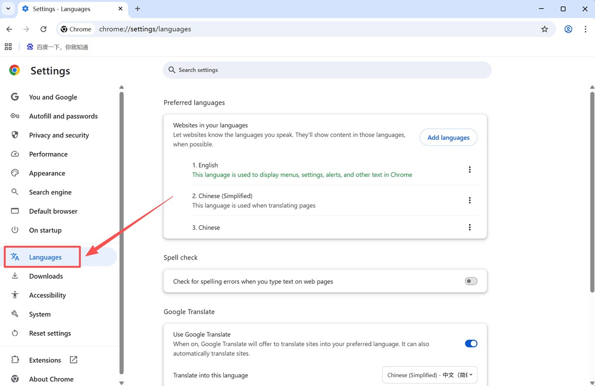 步骤2、在设置页面的左侧菜单中,找到并点击【语言(Languages)】选项