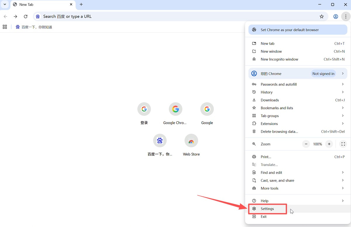 步骤1、在电脑上启动Chrome浏览器,点击右上角的三个点图标,在下拉菜单中选择【设置(Settings)】