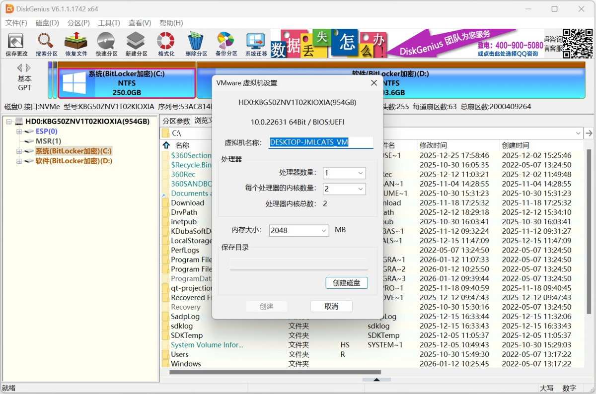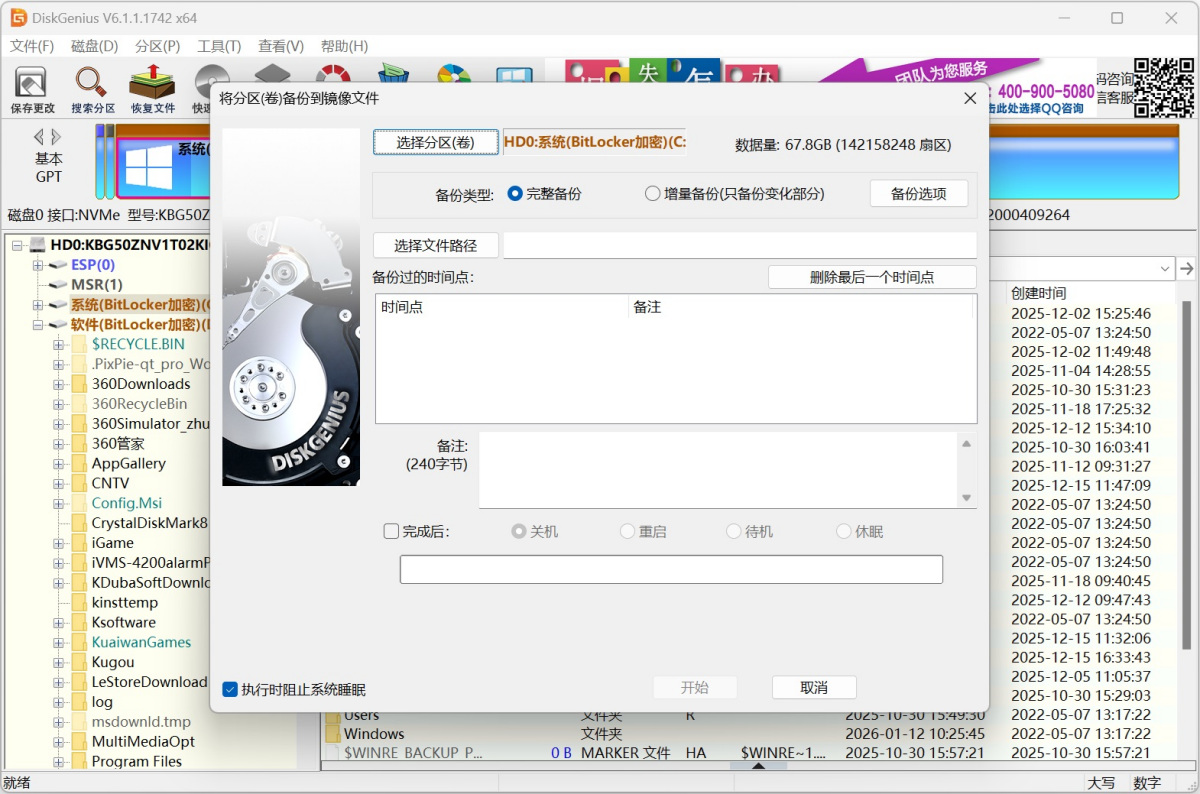 DiskGenius支持备份BitLocker加密分区,为数据提供额外保护。当分区数据出现问题时,可以通过备份文件进行还原。