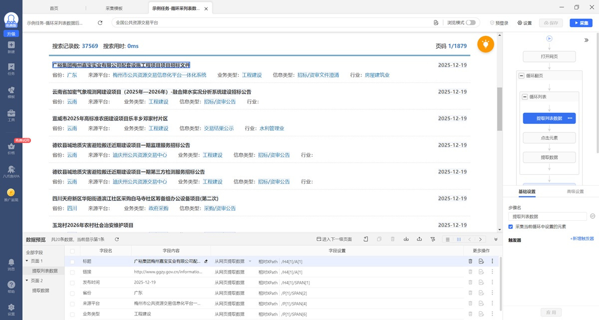 无需学习爬虫编程技术,可视化采集流程设计,0基础小白也能轻松上手。简单3步即可获取网页数据。