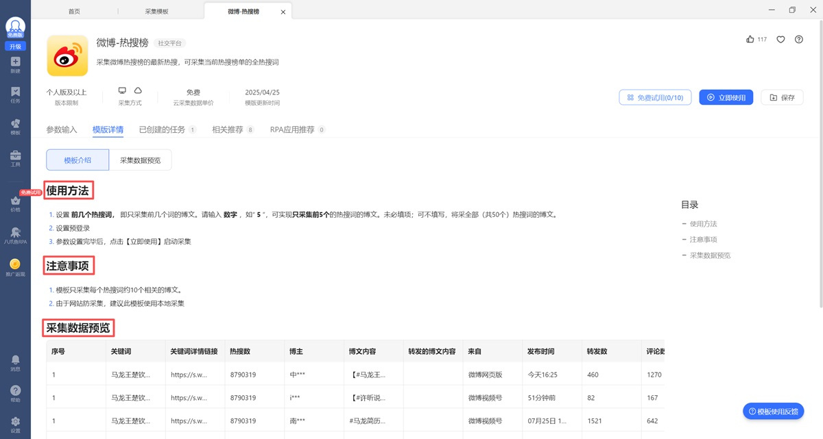 步骤1、进入【模板详情】后,仔细阅读【使用方法】、【注意事项】、【采集数据预览】,确认模板的具体使用方法以及此模板采的数据符合需求。