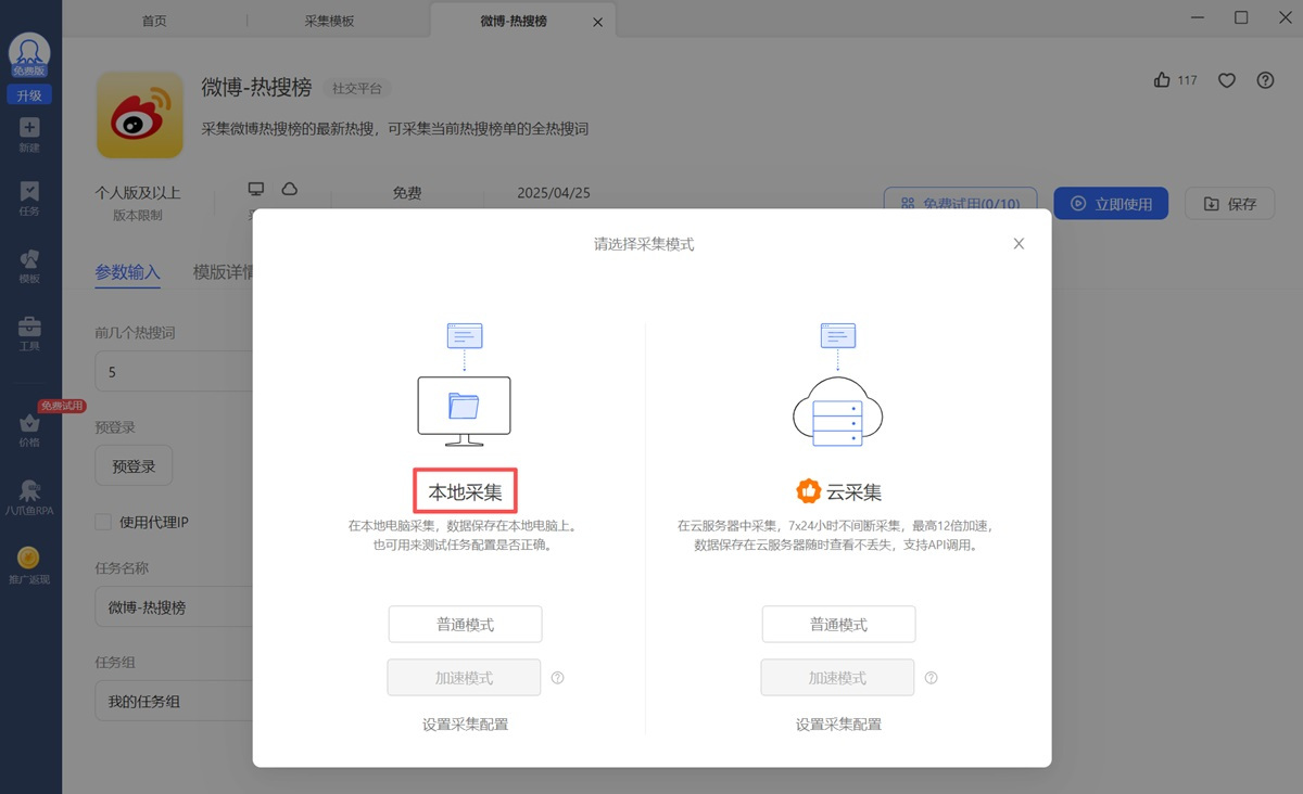 步骤3、然后点击【立即使用】,选择启动【本地采集】。八爪鱼自动启动1个采集任务并采集数据。