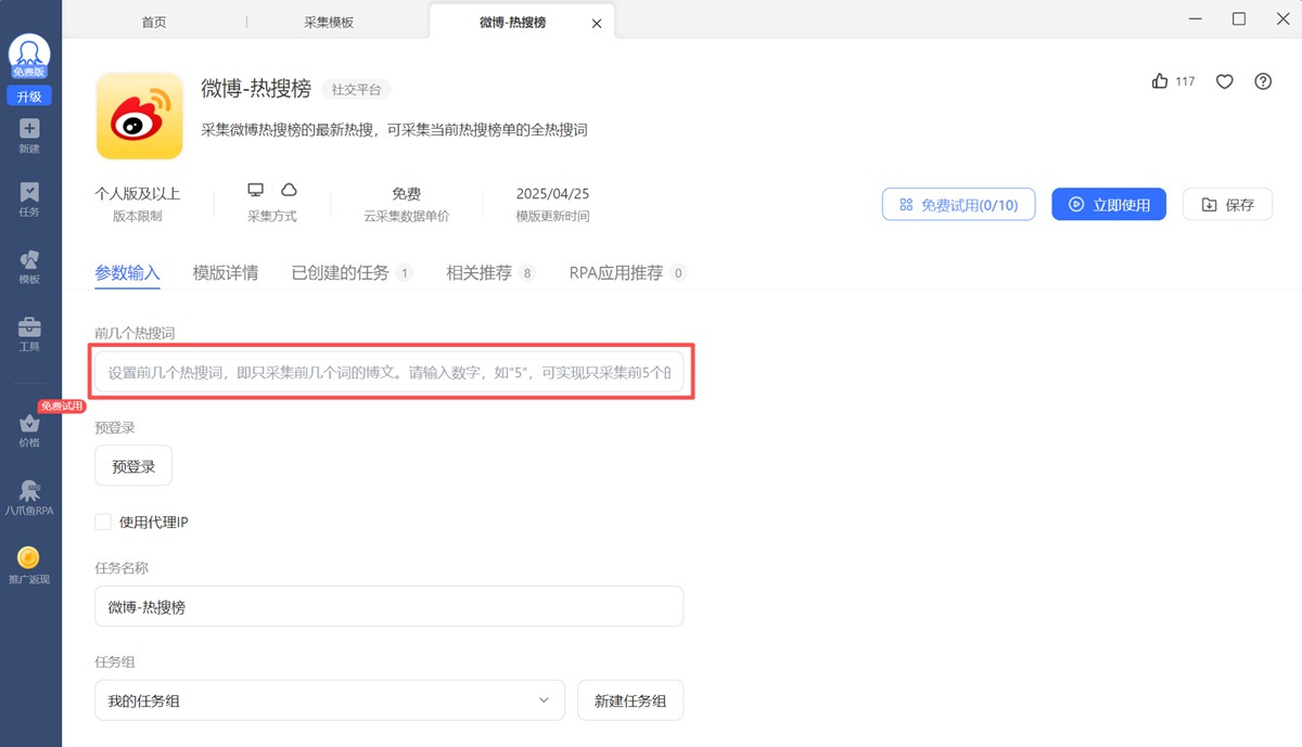 步骤2、确定模板符合需求以后,点击【参数输入】,自行配置参数。常见的参数有关键词、翻页次数、URL等。请认真查看【模板详情】中的使用方法和参数说明,输入格式正确的参数,否则将影响模板的使用。