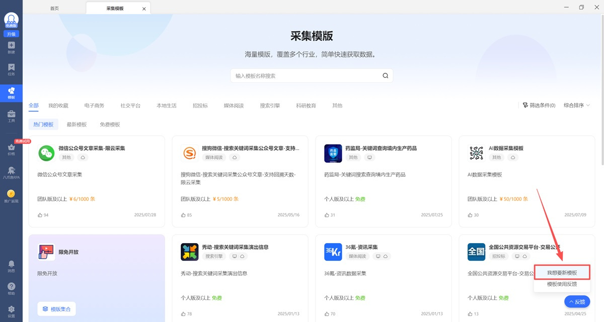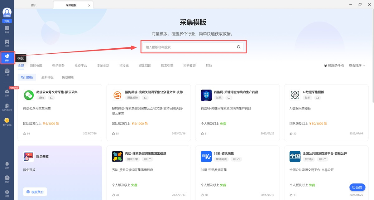 点击左侧菜单栏中的【模板】,进入采集模板展示页面。可通过【模板类型】、【搜索模板】多种方法,寻找目标模板。