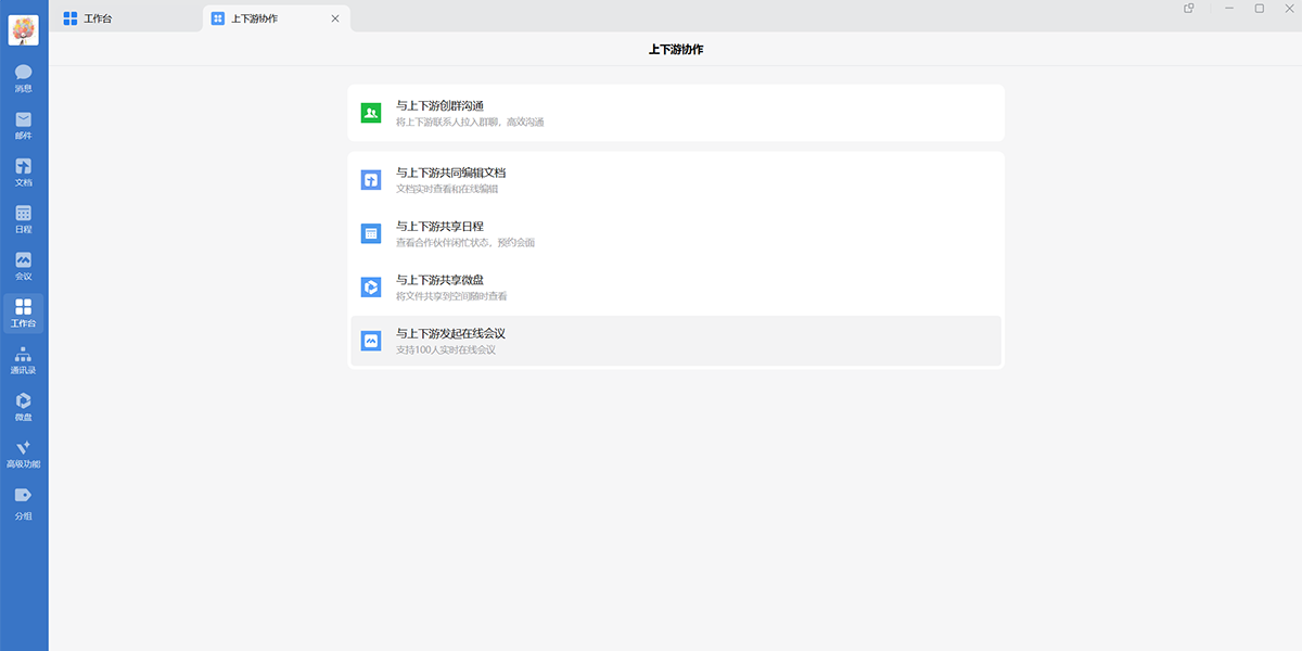 2、上下游:在上下游,你可以统一管理供应商、经销商等业务伙伴的联系人,快速找人沟通;使用文档、会议、日程、微盘等工具高效协作,跨企业共享应用打通业务流程。