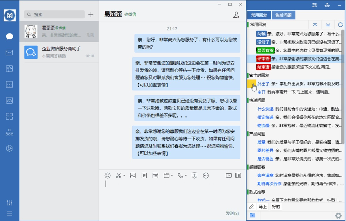 易歪歪是一款用于网络客服接待人员快速回复的工具软件,可自动吸附目标窗口,实现一键快捷回复客户信息,话术预先存储,实现高标准、高质量统一回复,针对性相对关问题预先存储,使得新手客服也能快速投入工作状态,为培训客服省去大量培训时间,由于超高的扩展性与灵活性,我们支持近乎PC所有软件的跟随与快捷发送,使得您随时切换任意新款聊天软件,均能够得到易歪歪的插件扩展服务。
