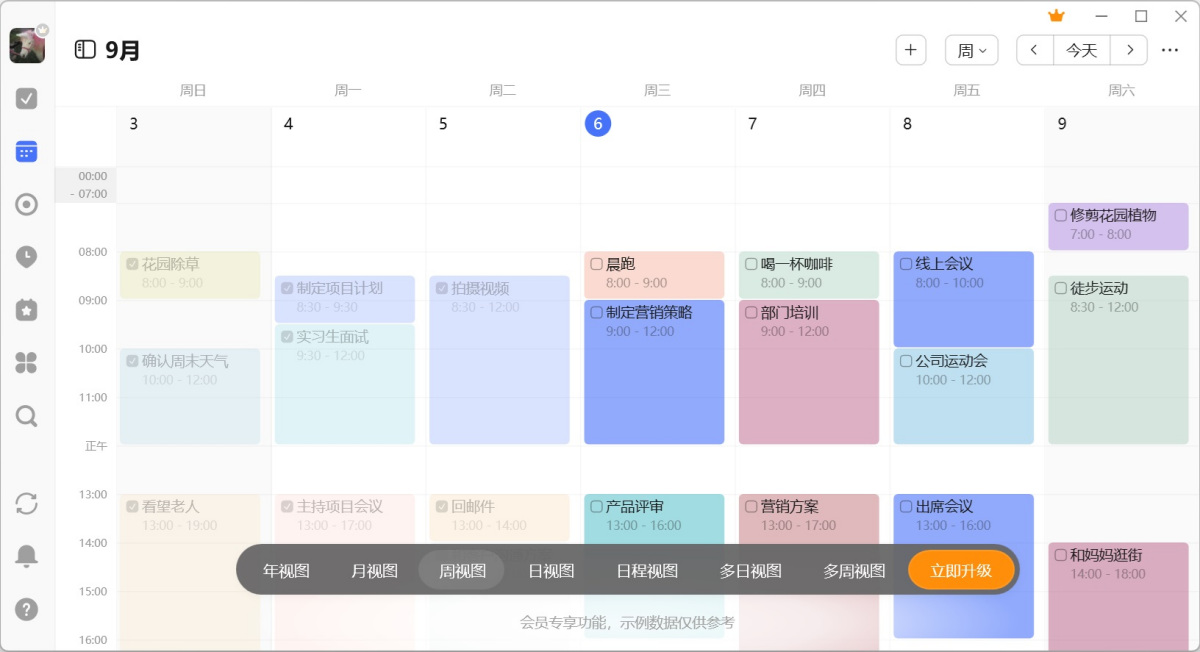 3、周视图:周视图提供了更加具体的一周时间轴,你可以直观地看到一周的空闲或忙碌状态,并自由地制定和调整安排。