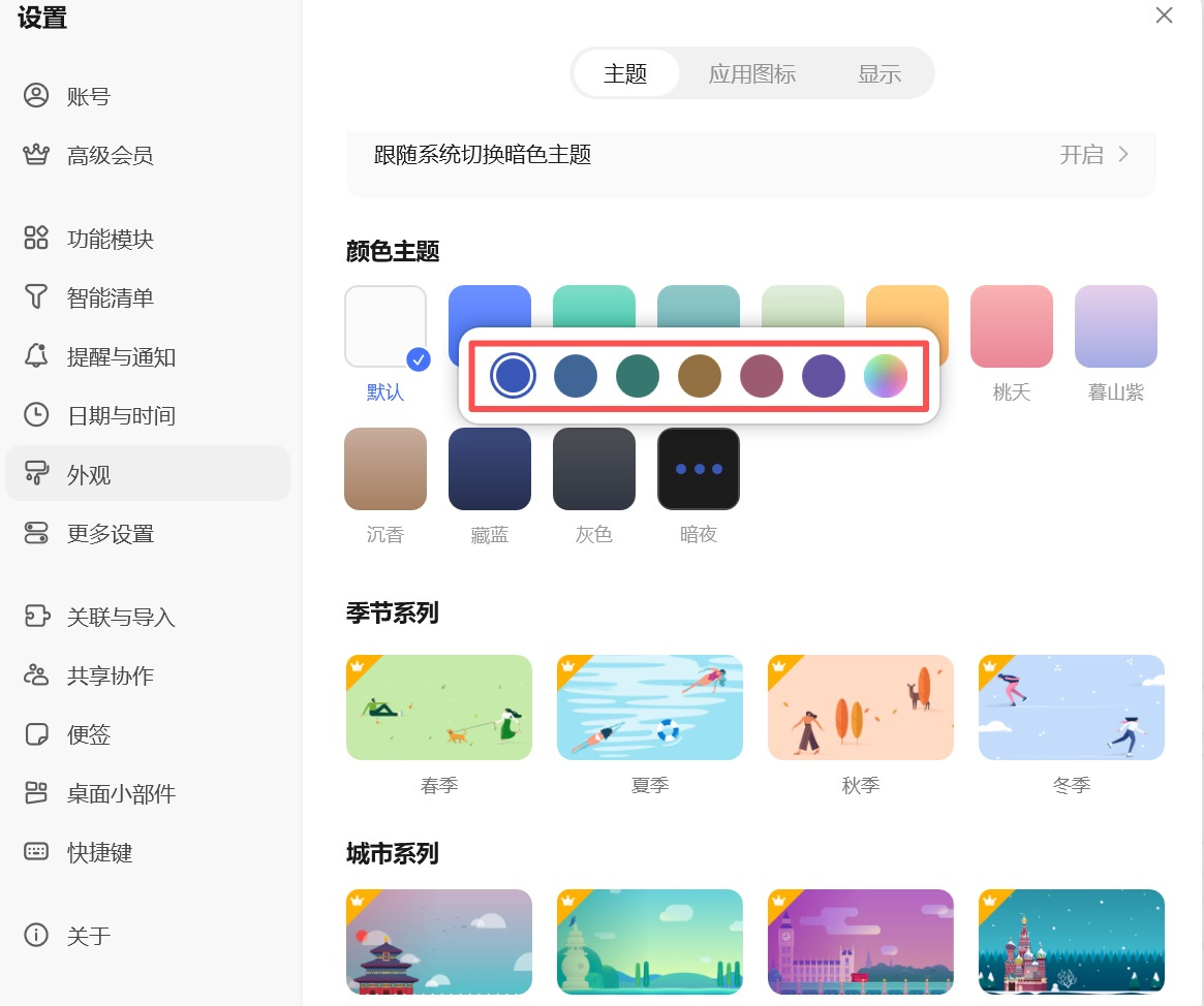目前,滴答清单已经支持颜色、季节系列、城市系列、摄影系列以及自定义主题。