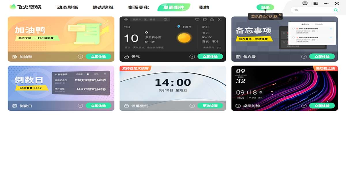 飞火动态壁纸是一款拥有15万+动静态壁纸的电脑桌面美化软件。拥有4k超清动态壁纸,游戏,动漫,趣味粒子互动风格高清壁纸任你选,还有酷炫鼠标皮肤,透明任务栏美化等一键桌面美化功能,让你的桌面动起来吧! 飞火动态壁纸汇集海量壁纸资源,众多超清无水印动态壁纸让您自由选择,优质静态壁纸免费下载。智能提醒让你晴雨先知,备忘事项提升办公效率,各色桌面美化功能及优质壁纸一键美化你的桌面,让你的桌面动起来! 更有各种隐藏彩蛋等着你哦!