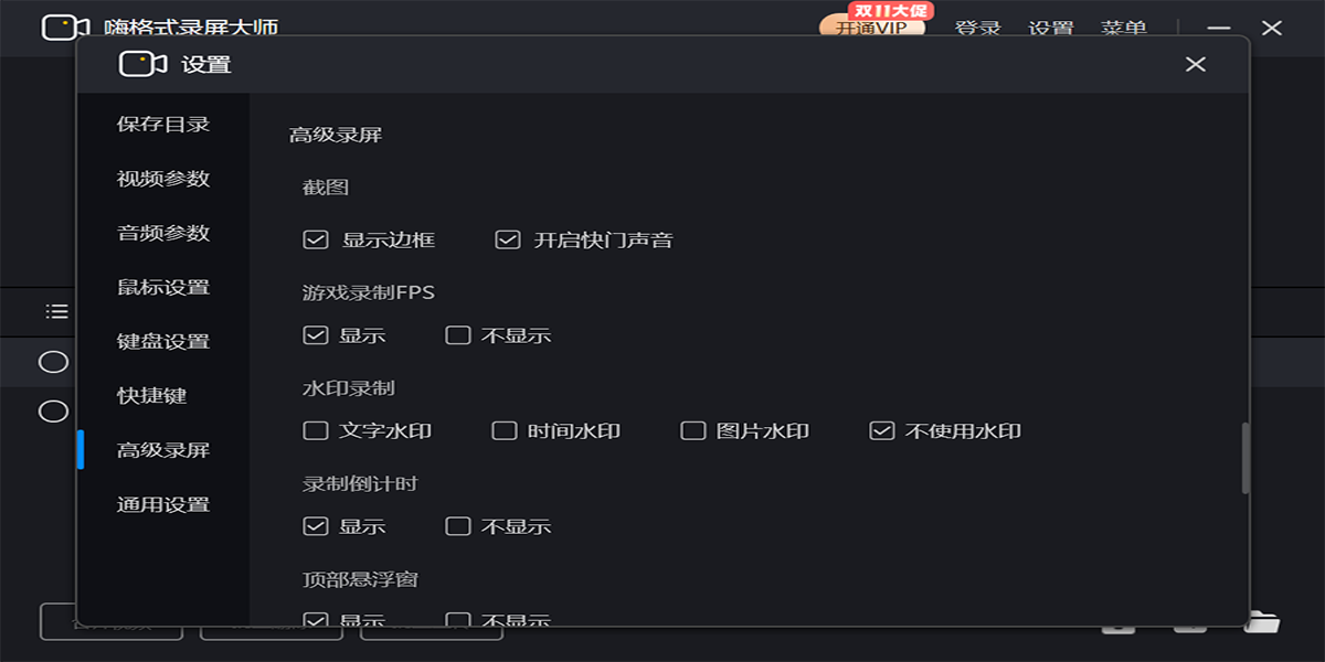 1、下载并安装打开软件后,右上角点击设置,在高级录屏中选择「水印录制」,并根据需求添加自己希望设置的水印,这边以图片水印为例