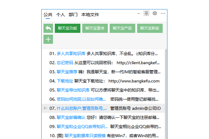 启动聊天宝软件后,聊天宝会吸附在QQ或微信等聊天窗口的右侧和底部。右侧显示了公共知识库和个人知识库,以及知识库分类,点击右侧知识库,可以一键发送。底部提供了关键字检索功能和常见问题功能。支持关键字以及拼音快速检索回复内容,一键发送。