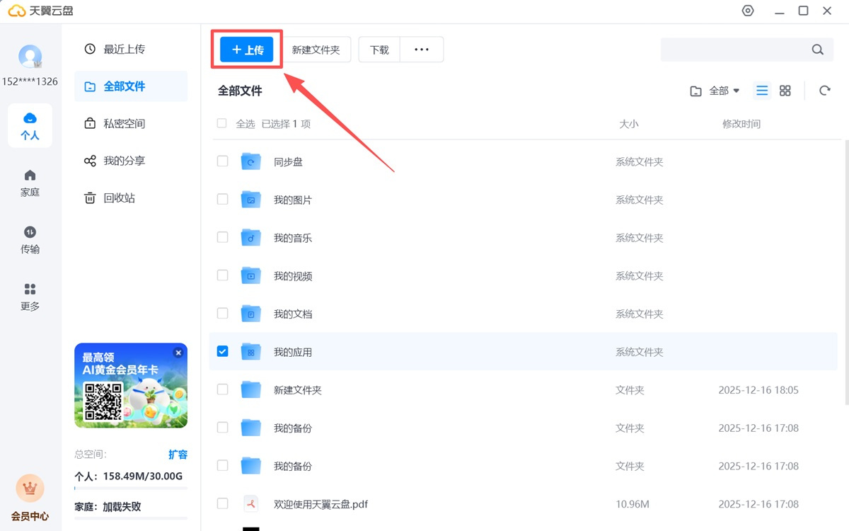 方法二:点击PC客户端中的全部文件栏目,把文件上传到指定的目录。点击“上传”按钮后,选择需要上传的文件即可。