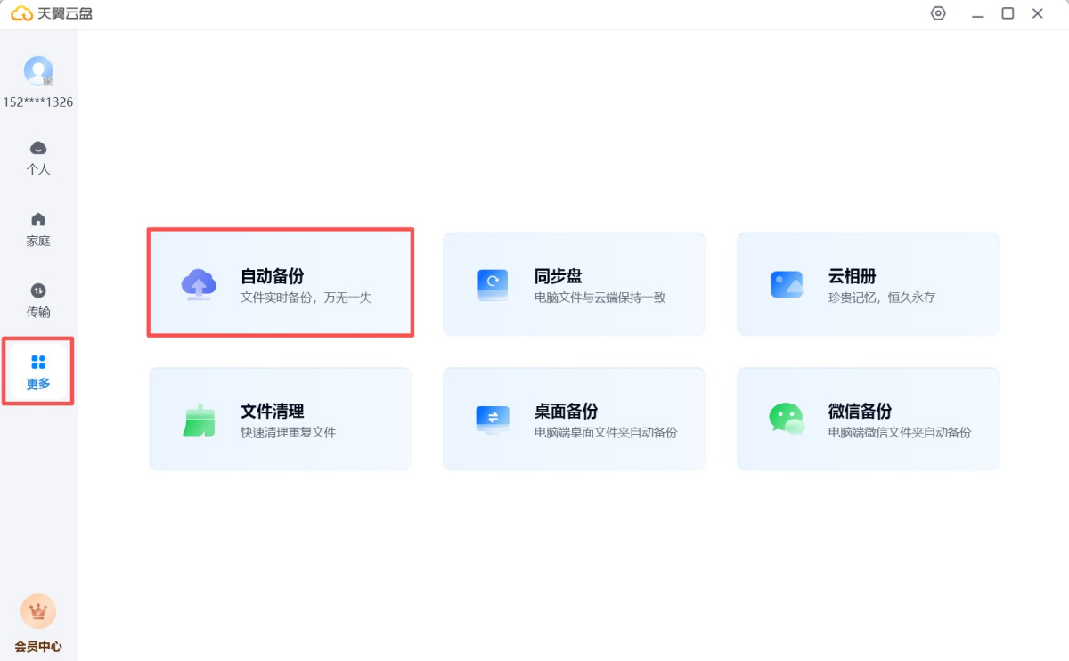 步骤1、打开天翼网盘客户端,选择左侧【更多】,点击【自动备份】