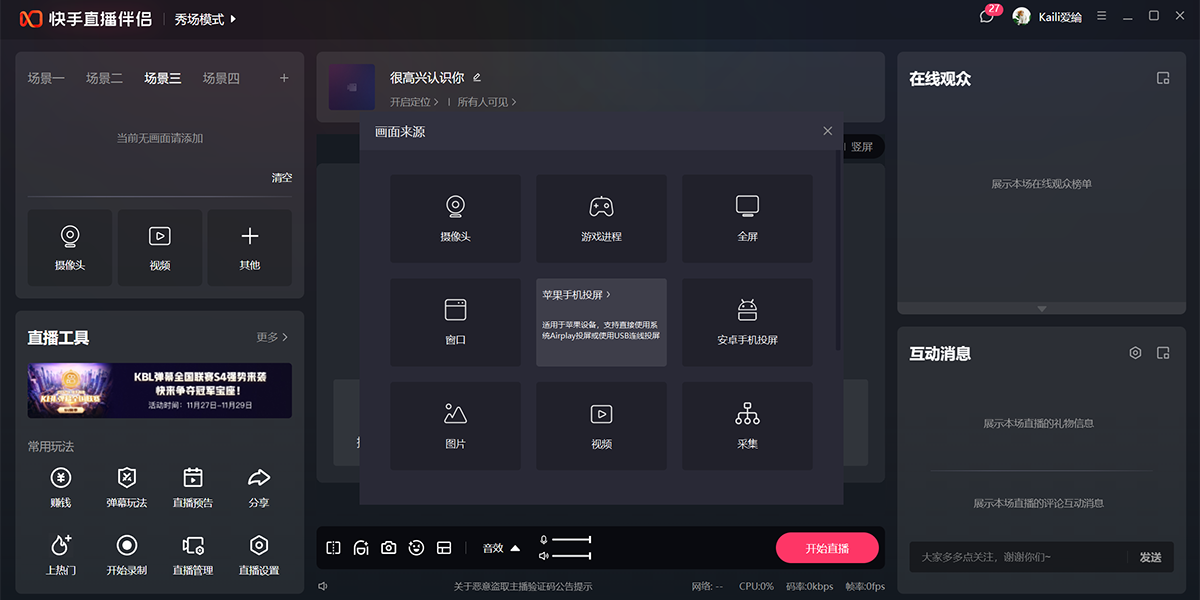 快手直播伴侣是一款界面简单、功能实用的直播辅助工具。在快手直播伴侣中小伙伴可以快速的进行一系列的直播活动,操作玩法非常的出色,快手直播伴侣是小伙伴在直播中美颜,美声等等,热爱游戏的主播终于可以开始用电脑进行直播了,安装快手直播伴侣后即可开始直播,但是需要你已经获取到快手APP上的直播权限。
