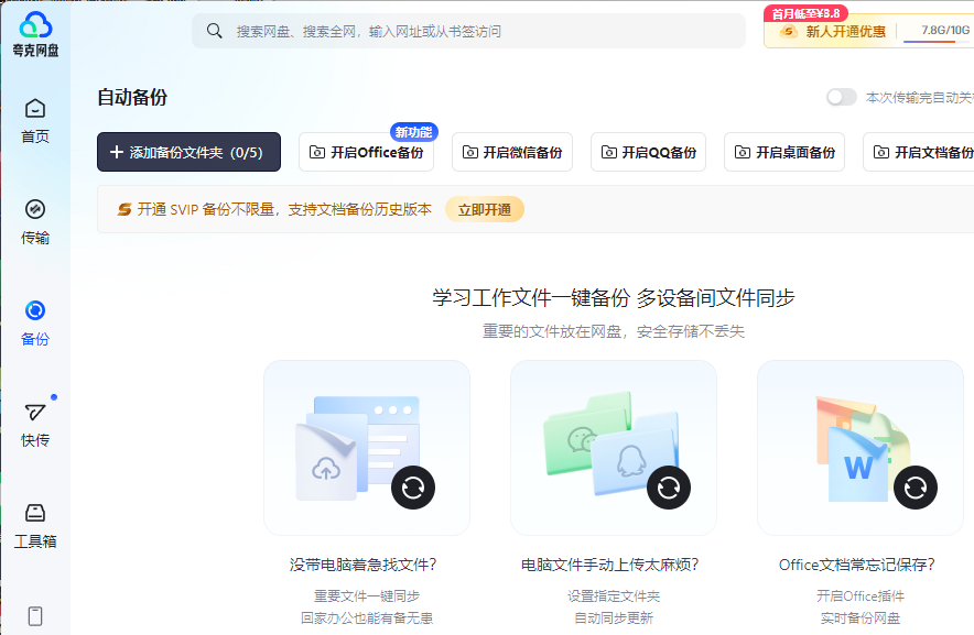 4、一键备份把电脑搬到夸克网盘:电脑内存不够?珍藏资料怕丢?微信文件过期打不开?登录夸克网盘开启备份,支持微信/QQ/桌面/文档/下载备份、指定文件夹备份还可以拖拽、复制粘贴、右键菜单批量手动上传;
