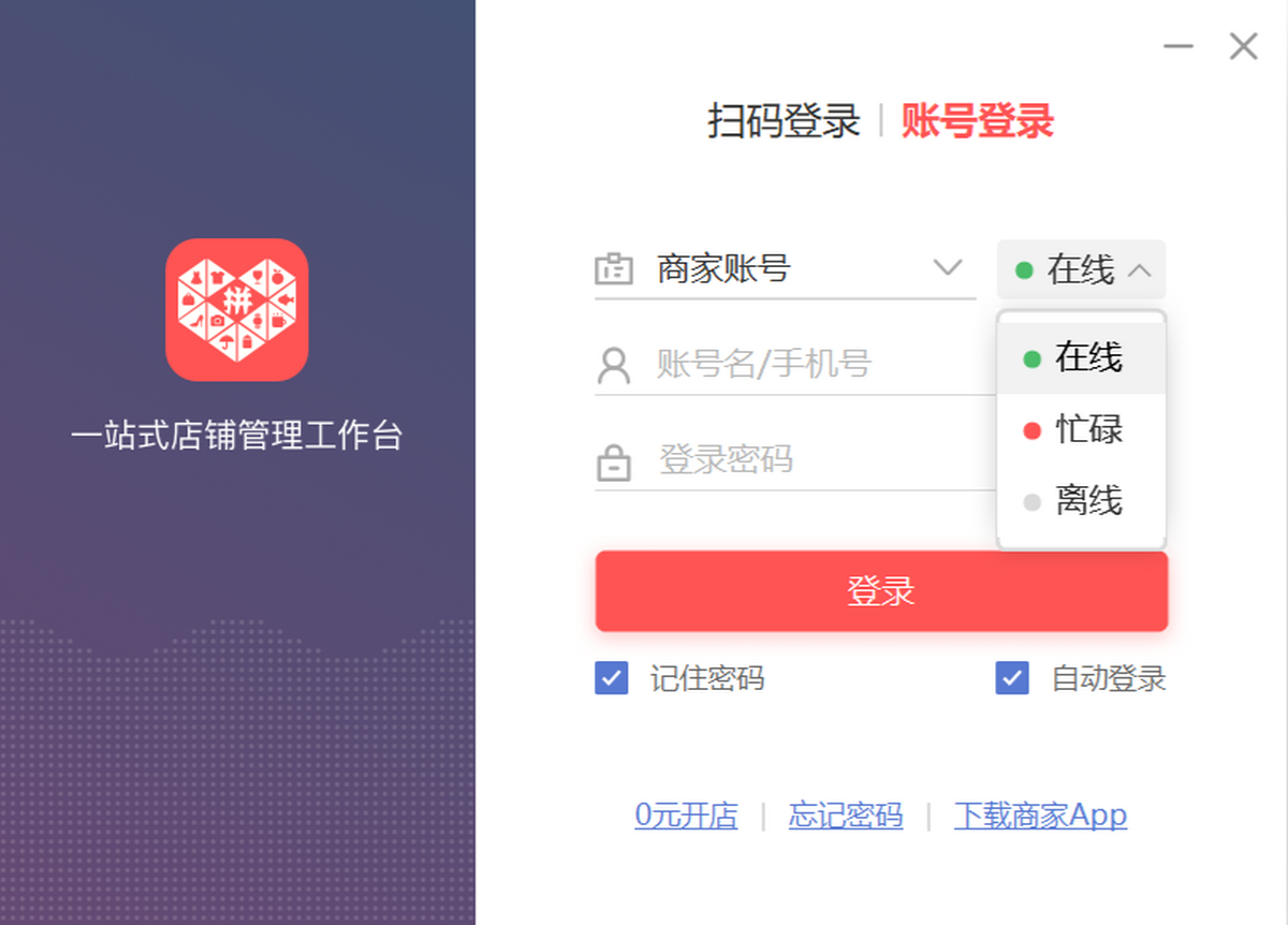 ●若您登陆的是子账号:子账号仅支持使用“账号名+密码”或扫码方式登录商家后台/商家APP/Windows客户端/微信公众号绑定。 若您忘记账号名,可点击忘记账户名按钮进行找回或咨询主账号。主账号可以使用手机号+密码方式登录。