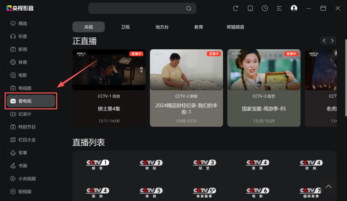 步骤1、打开央视影音客户端,点击左侧【看电视】