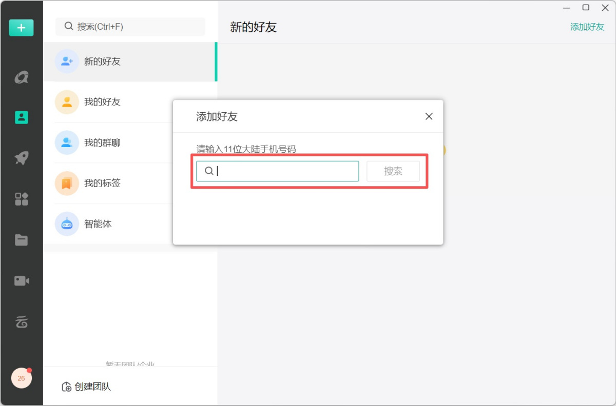 步骤3、输入好友的11位大陆手机号码,点击【搜索】即可