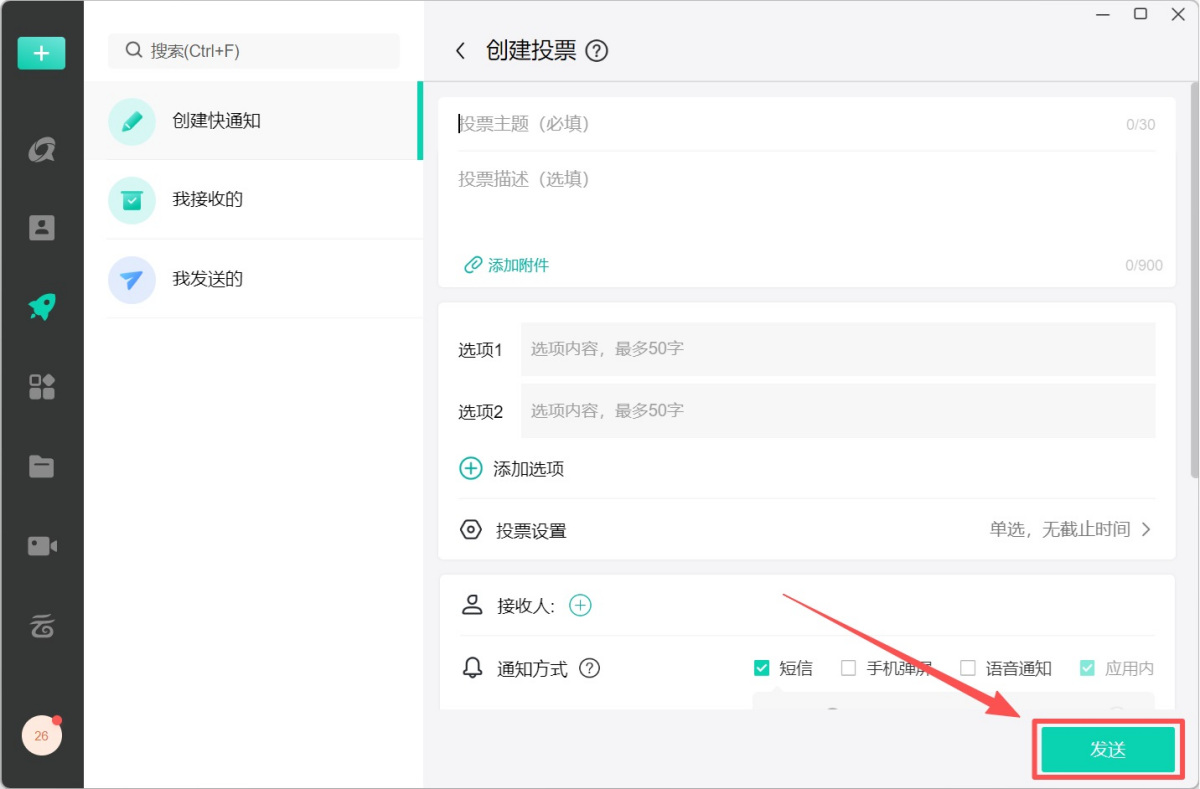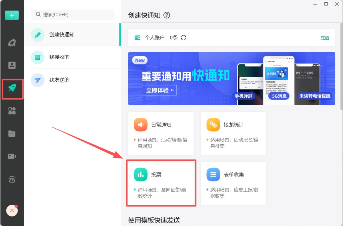 步骤1、选择左侧栏【快通知】,点击【创建快通知】→【投票】